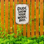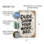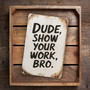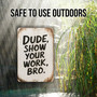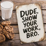 Rustic "Dude, Show Your Work, Bro" Metal Sign - Distressed White Background With Bold Handwritten Look - Humorous Wall Decor 8x12