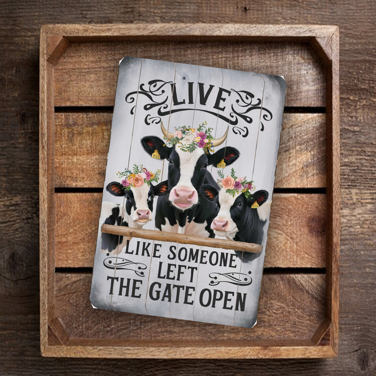 - Rustic Metal Sign With Three Floral Crowned Cows - "Live Like Someone Left The Gate Open" - Farmhouse Wall Decor